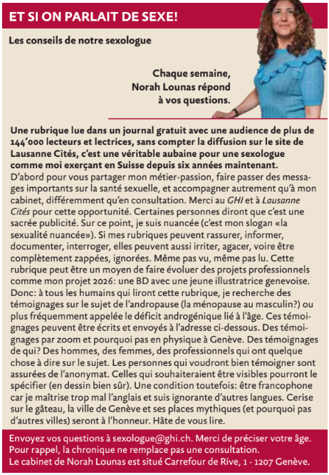 Être lue chaque semaine dans un journal gratuit avec une audience de plus de 200 000 lecteurs et lectrices, et voir ses textes diffusés également sur le site de Lausanne Cités, est une véritable opportunité. Pour une sexologue exerçant en Suisse depuis plusieurs années, c’est bien plus qu’une visibilité : c’est un espace de transmission, de réflexion et de dialogue autour de la santé sexuelle.